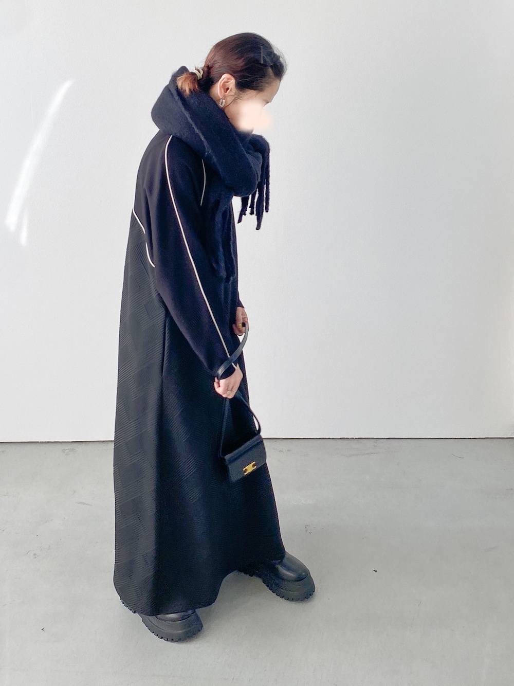エンボス加工の生地が独特のニュアンス! 1枚で着映える個性派ワンピ ボリュームソールのブーツとマフラーを合わせて モードな着こなしに🖤