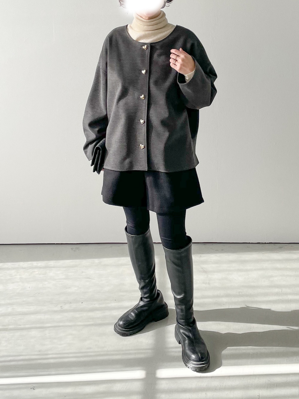 le_yume(SUGAR BISKET)のノーカラージャケット「前後2wayハートボタンショートコート」を使ったコーディネート