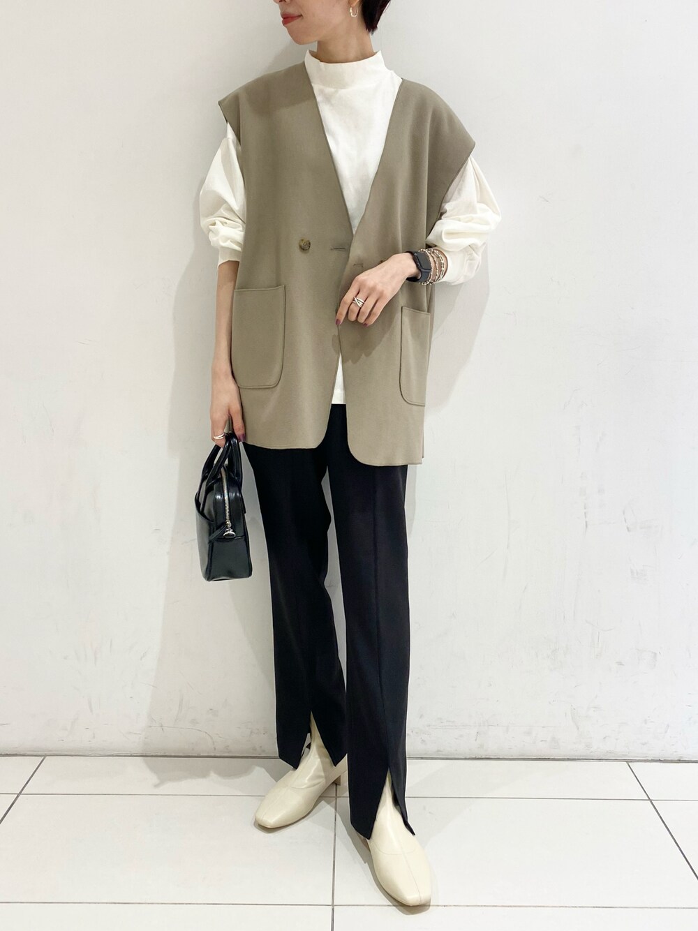 首元がすっきりしたベストは、ハイネック合わせがおすすめです!袖にボリュームがあり、バランス良く着られますよ^_^クリックすると、袖元のアップも見られます!