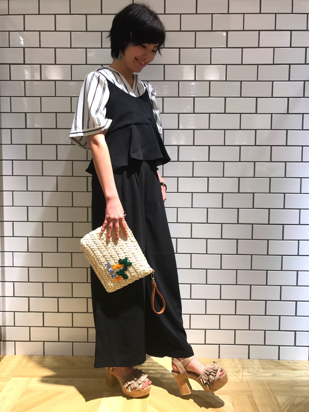 キャミとワイドパンツがセットになったこちらのアイテムは、別々にも使っていただけるので着回し力も抜群です^^♪ キャミの下にスキッパーシャツを合わせるのが今年らしく、抜け感のある大人カジュアルコーデにしました☆