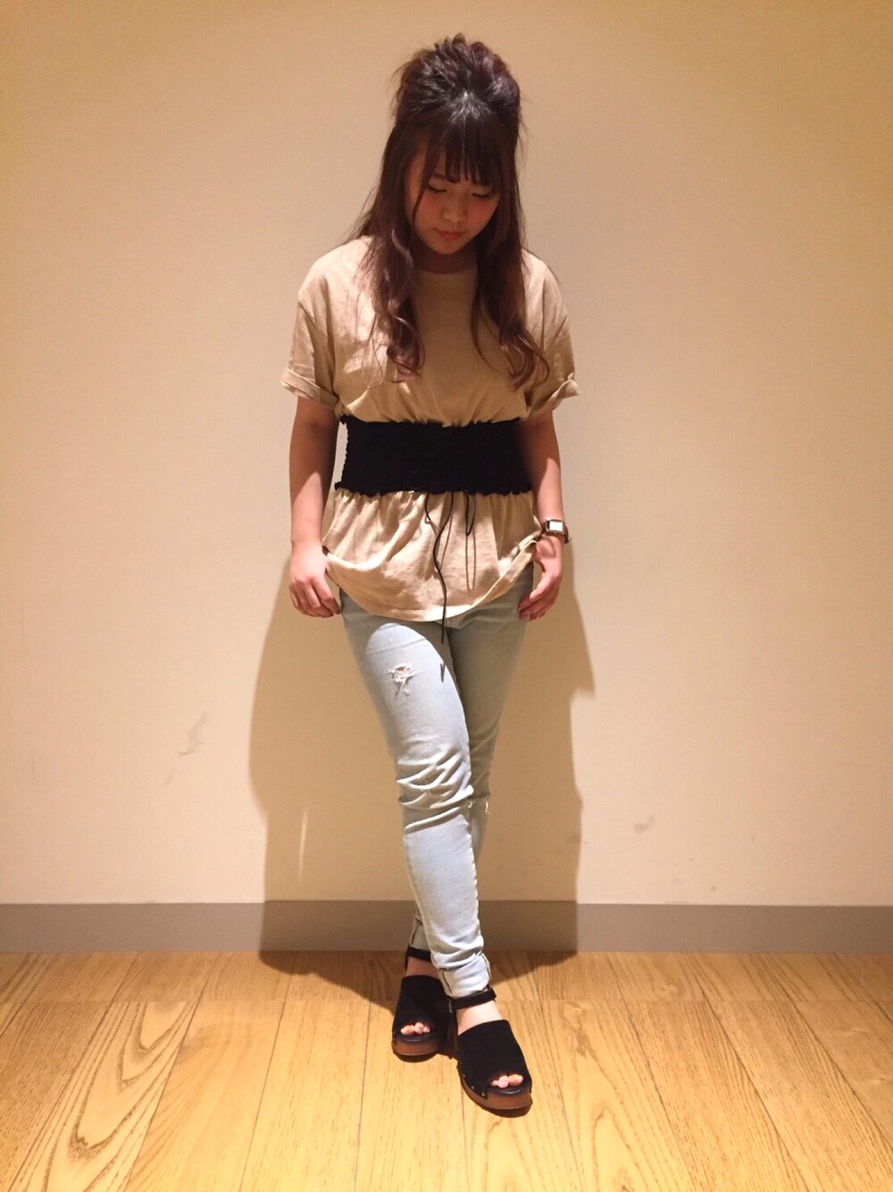 新作アイテムのドッキングTEEを使ったコーディネートです!ウエストにベルトがドッキングされているのでスタイルアップ効果抜群のアイテムとなっております☆ワイドパンツと合わせても可愛いです^^