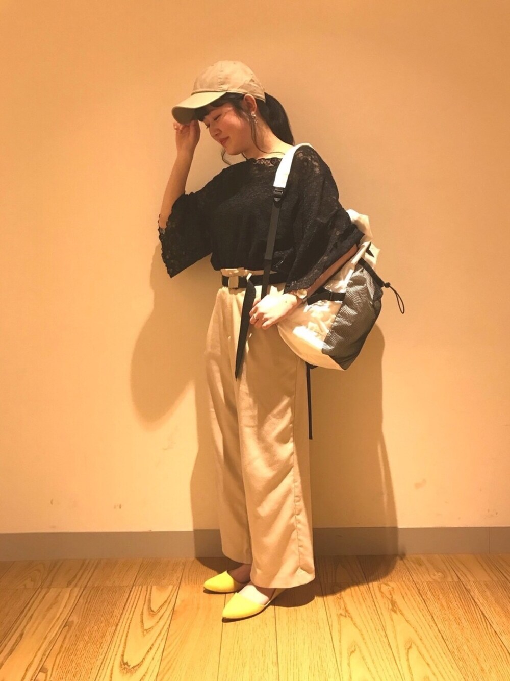 黒のフレアレースをスポーティに着こなしたコーデ☆ スポーティな小物アイテムを合わすだけでこんなにもカジュアルに着れます! 春でも黒とアイボリー合わせであれば重たくならないです💓 差し色でビタミンカラーのイエローパンプスも可愛いですね!