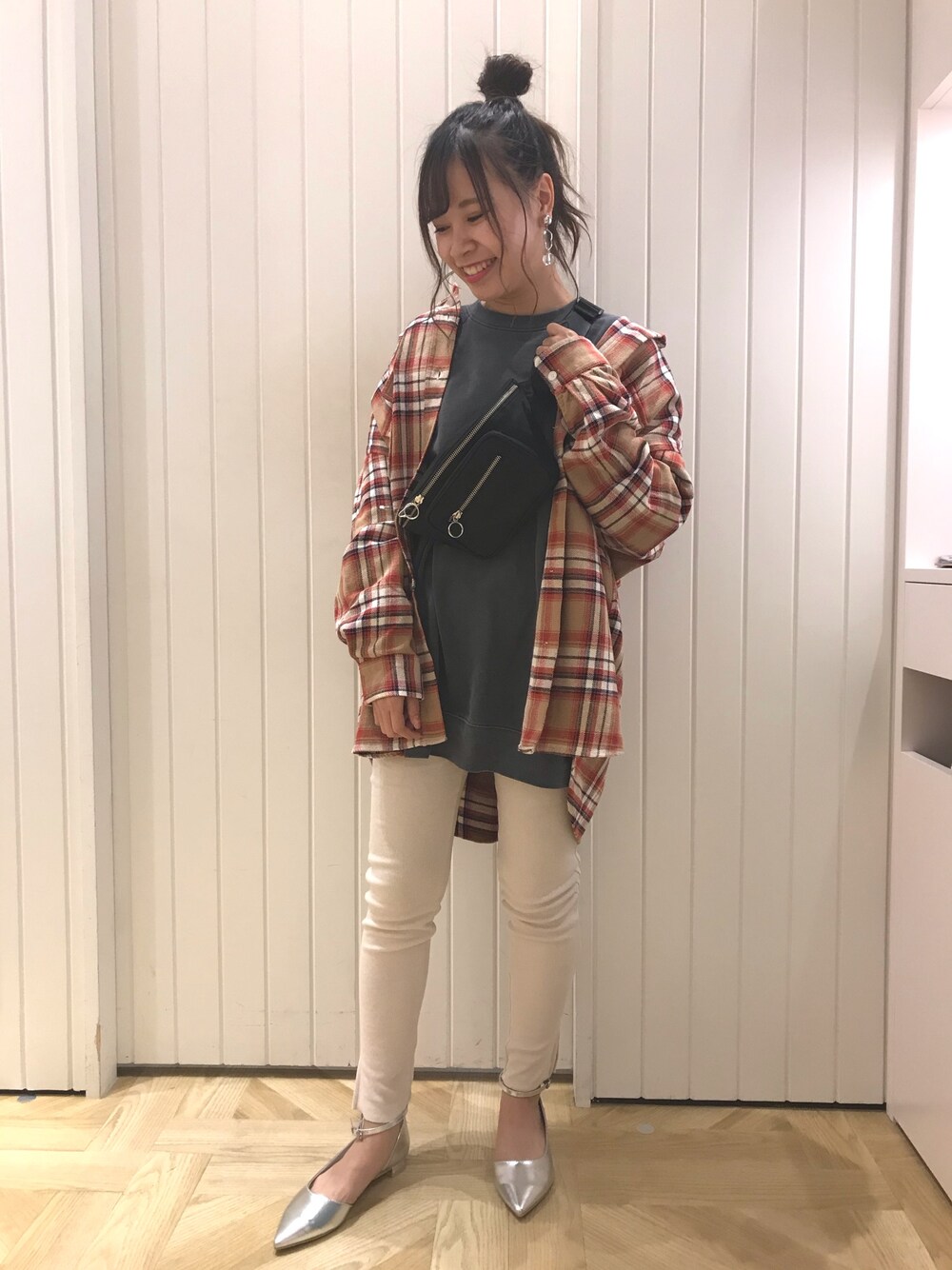 大人気のBIGチェックシャツと、今年トレンドのレギンスを合わせた秋コーデです! カジュアルになりすぎないように足元にシルバーパンプスと、ジップもシルバーが目立つバックで合わせてみました☺️💓