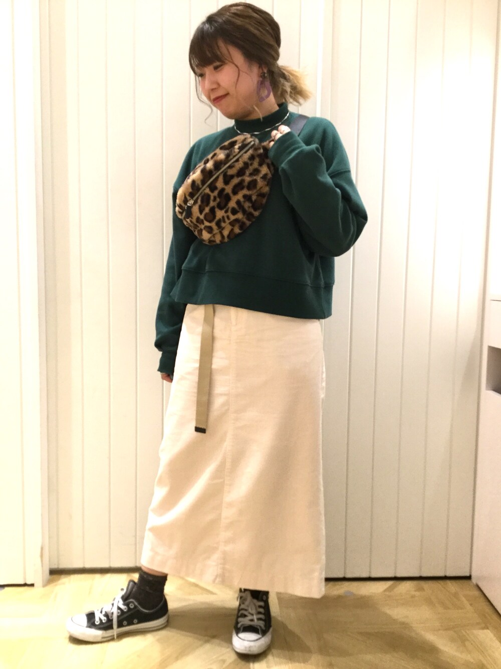 トップスだけでメンズっぽくならないように白のコーデュロイスカートでやわらかい印象に🤗♥️ トレンドのレオパードバックもポイントです👌💓