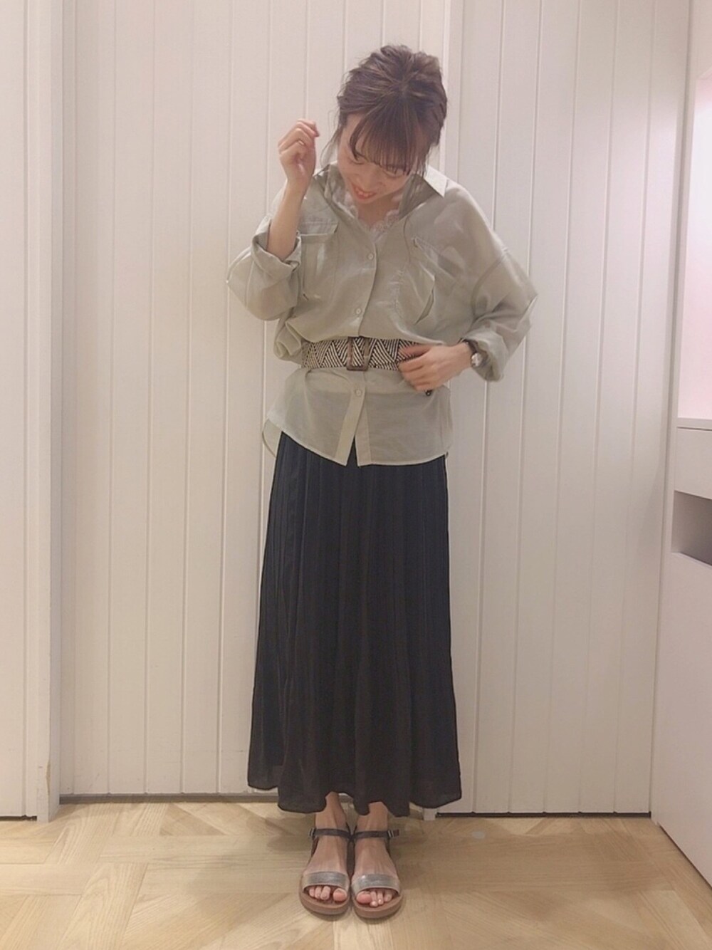 太めのベルトでウエストマークすることで スタイルアップの効果があります💓 シャツは透け感があるので、暗い色のアイテムと合わせても 涼しげな印象になりますね🍃