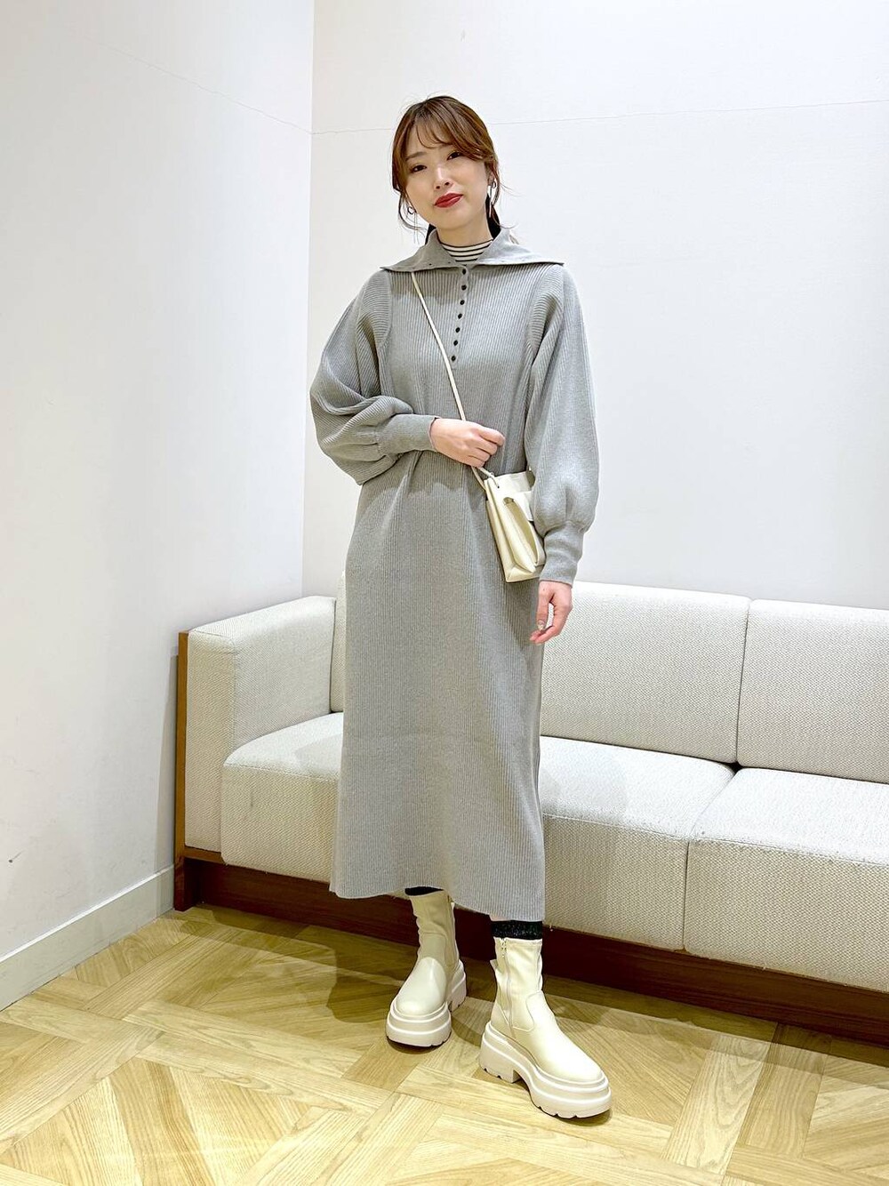 ワンピース▷▶︎▷ free size 襟元のボタンの開閉でハイネックにも襟を折りたたんでも着られます。 体のラインを拾いにくい素材とシルエットです♪ 袖にボリュームがあるのでカジュアルになり過ぎないデザインです。 身長167cmの私が着て脛くらいの丈感でした☻ 低身長スタッフはこちらから Instagramも投稿中▷▶︎▷ こちらも是非フォローお願いします♡♡