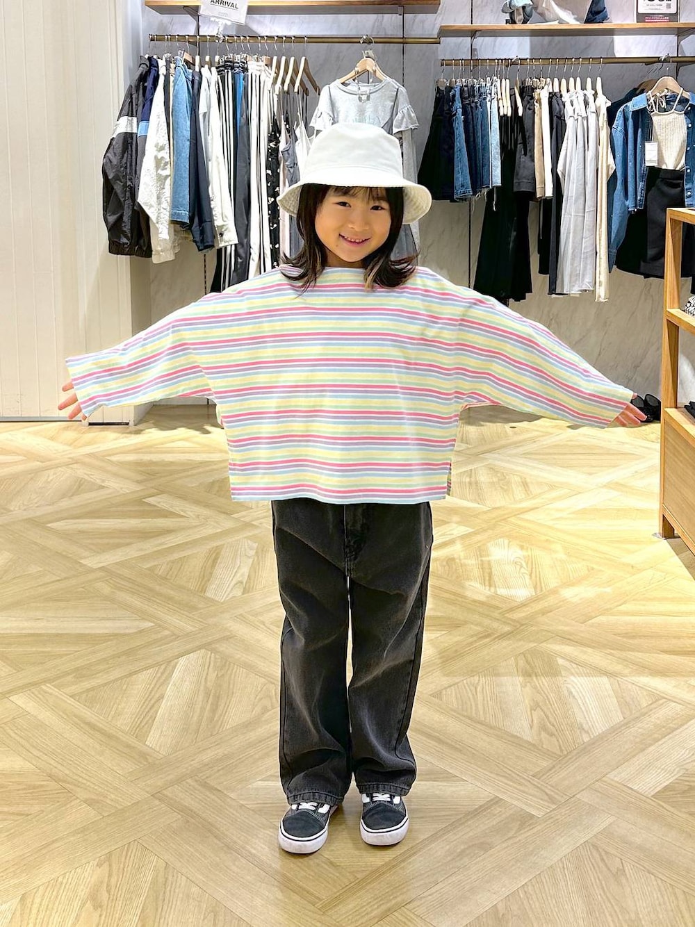 Tシャツ▷▶︎▷ 身長118cm、130size着用 ドルマンスリーブがとっても可愛いロンT♪ 着丈がやや短めです。 カジュアルにデニムパンツやショートパンツ合わせがおすすめです☻ パンツ▷▶︎▷ 身長118cm、130size着用 まるで大人のデニムの様な、綺麗なワイドストレートのシルエットです。 シンプルにTシャツ合わせするだけで決まるデニムです☻ ウエストのボタン、ファスナーは開けなくても着脱しやすい様になってます。 ブルーはこちら▷▶︎▷ Instagramも投稿中▷▶︎▷ こちらも是非フォローお願いします♡♡