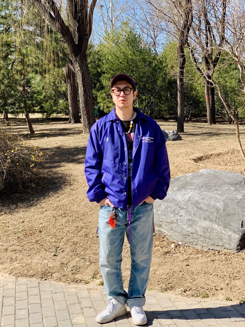春天到了,教练夹克穿起来🥳🥳🥳 - 🟣天气是越来越暖了,外面的人也开始慢慢变多了…但是小伙伴们还是要注意防护哦!今天给小伙伴分享一下教练夹克的穿搭哦~HERE WE GO… - 🟣关于教练夹克我也不太懂名字的由来…🤣,就说说我的穿搭感受吧。对于春季这个季节…教练夹克薄厚是比较合适的…一般夹克都不会夹棉,而且表面都是尼龙面料,比较防风。教练夹克也是好多潮流品牌每一季都会出的必备单品哦! - 🟣这款紫色的NBHD教练夹克配色比较鲜艳和出挑,所以在搭配的时候我还是比较冷静…😅,选择了黑色Sweatshirt作为打底,浅色水洗牛仔裤作为下身搭配,以紫色的P帽来呼应夹克,最后以一双纯白的AF1作为整身搭配的收尾。总体来说就是穿出教练气质就好啦!希望懂得更多的小伙伴来给我普及知识点哦!