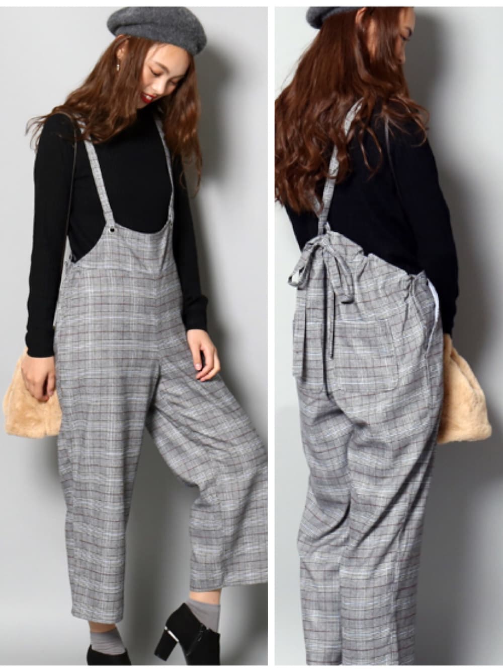 幼くなりがちなサロペットを、大人っぽく綺麗目に着ました✨ 流行りのグレンチェックでサロペットがポイント⭐️ 後ろのリボンは、ギャザーではなく、見頃幅の調整で絞るタイプなので 窮屈感は無いです。インにセーターを着てベレー帽で モノトーンに決めました💕 サロペットは、マタニティーとしても着れて、産後にも着れそうで◎です♪