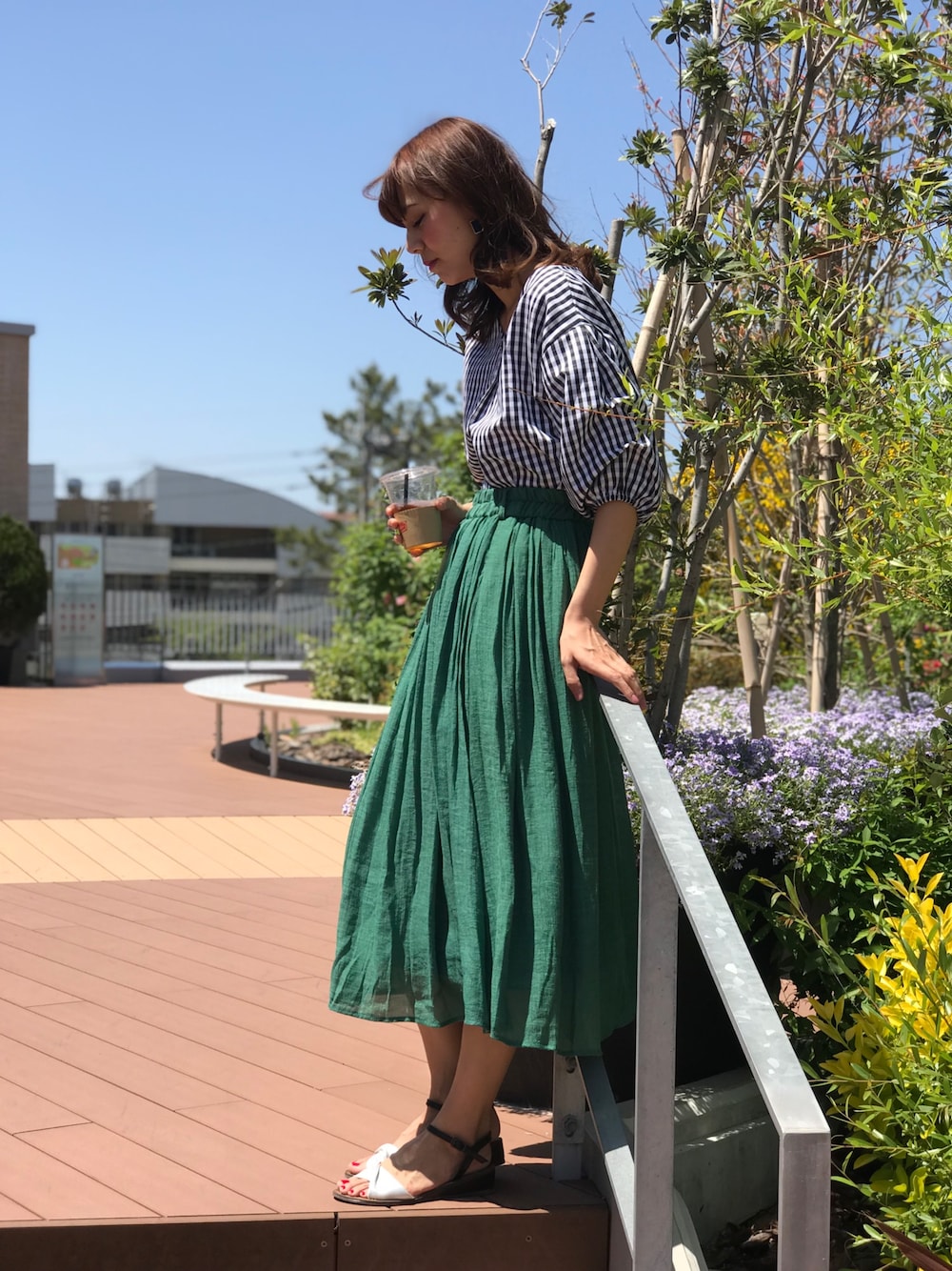 カラフルなグリーンスカートがキレイで 新鮮!! 旬な ギンガムチェックのブラウスを合わせて 今1番のお気に入りコーデ