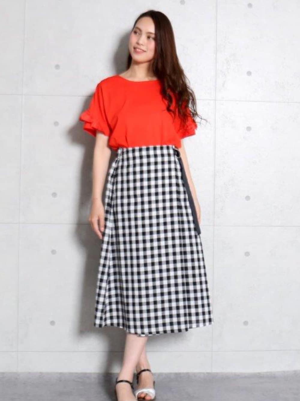 旬のブロックチェックスカート♪ Dカンベルトと、台形スカートの形が スッキリとした印象に♪ 幼くなりがちなギンガムチェックのアイテムも この形なら大人女子も安心してお使い頂けます♪ トップスは、袖フリルが可愛いシンプルカットソー💕 女子力高めのアイテムの組み合わせです🎵