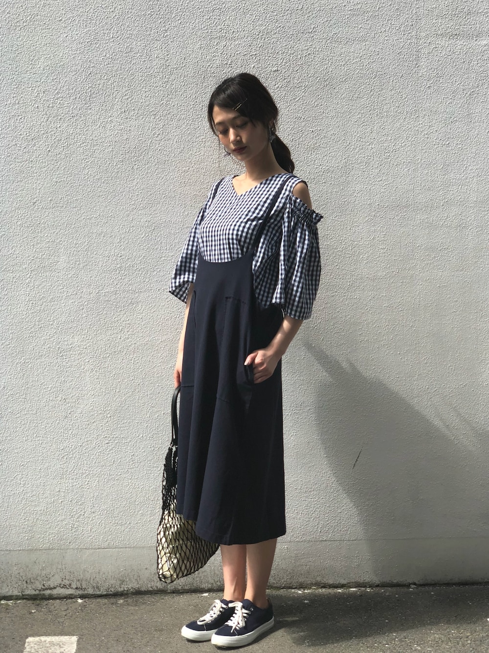 麻混のジャンパースカートが心地よい季節 コールドショルダーのギンガムチェックブラウスと合わせて 旬コーデ💕 デートにも❤️ママコーデにも🎵
