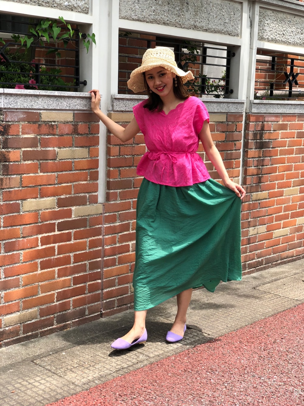 今年欲しかったグリーンスカートにあえての メリハリ ピンク!コーデ💕 スカラップがカワイイ大人ブラウス