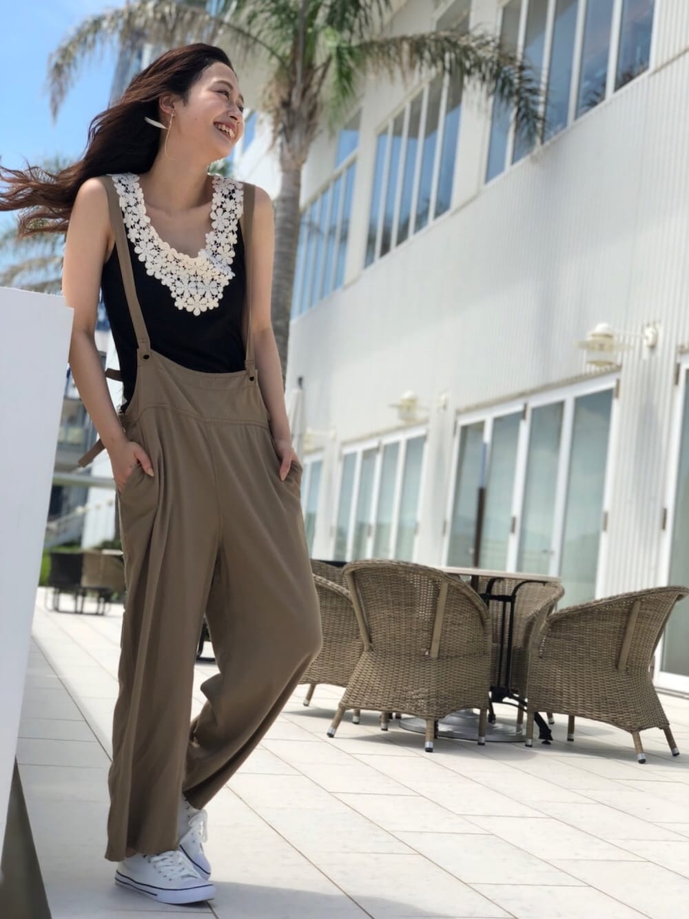 フラワーモチーフで大人かわいいサロペカジュアルで 休日