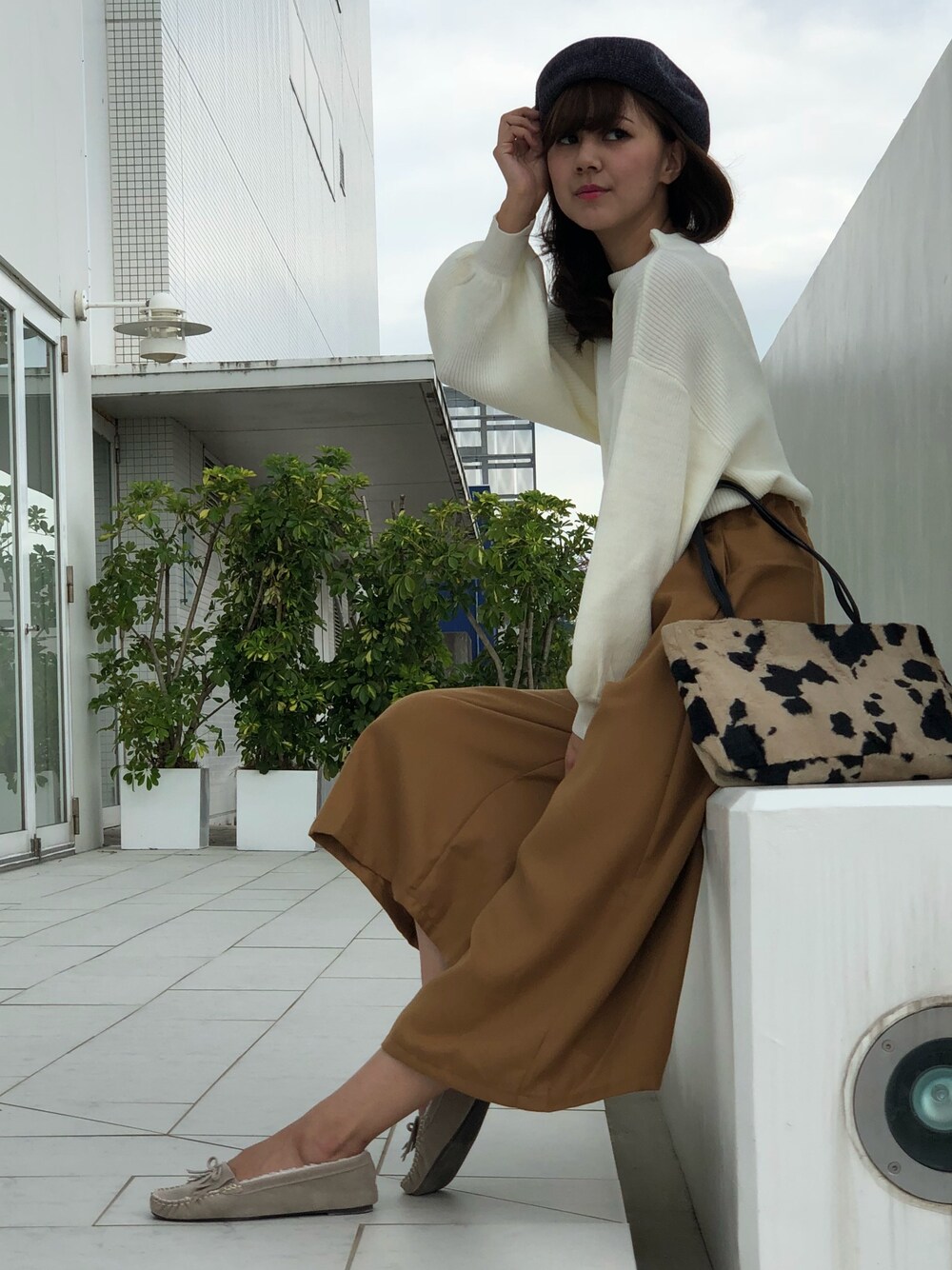 キャメルのパンツが 秋らしく ネック周りがキレイなざっくりドルマンスリーブ アニマル小物プラスがおススメスタイル
