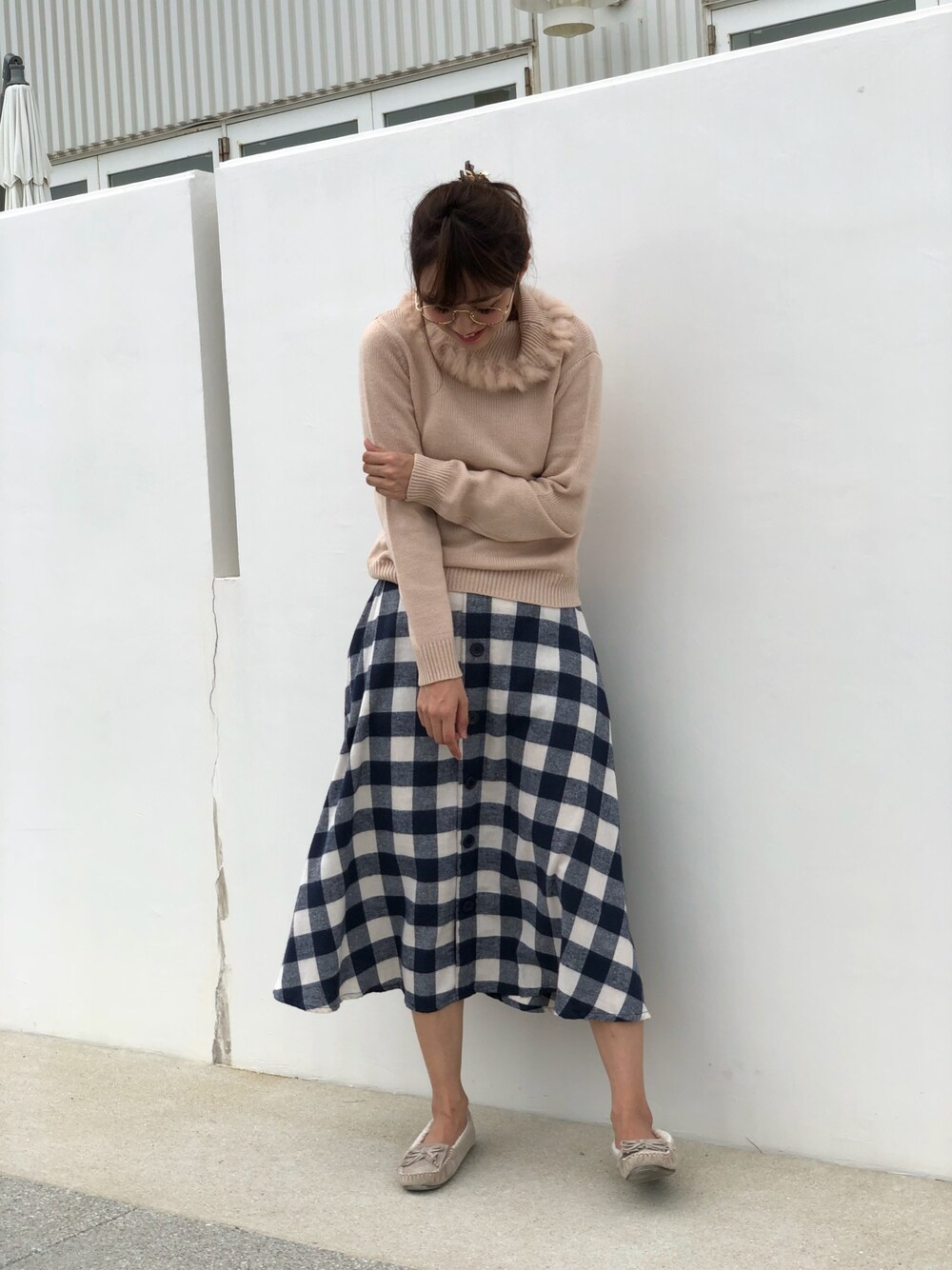 ニットにファーをあしらった カワイイ系セーター❣️ この秋着てみたい!! 旬のチェックは ブロックチェックスカートの着まわし