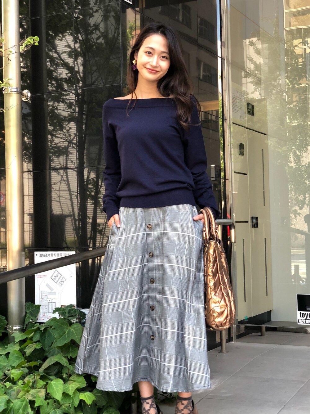 キレイ目通勤コーデ!グレンチェックロングスカートに 首元キレイなニット