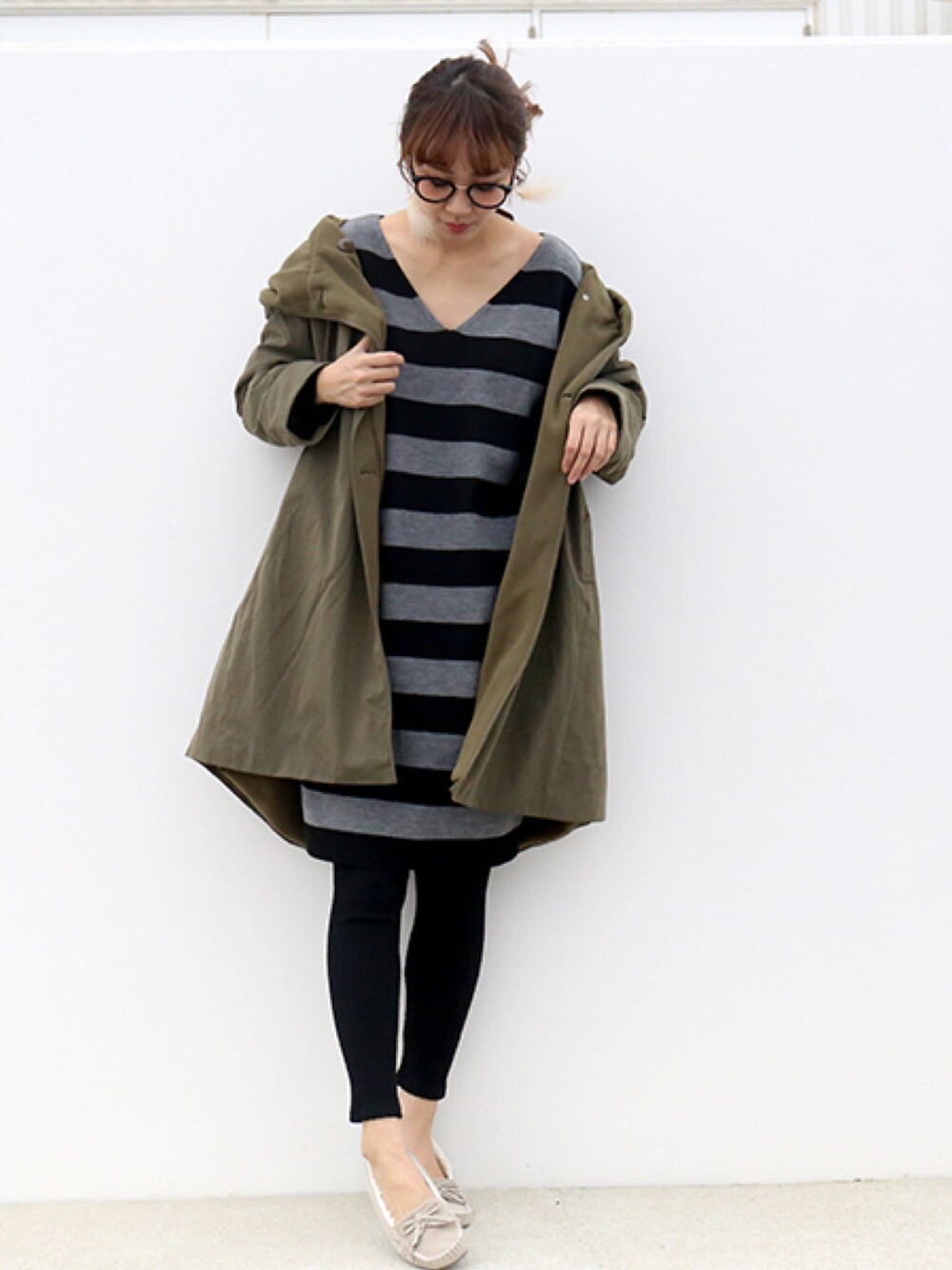 カーキのアウターで きちんとも着れるニットワンピースを抜け感出して こなれ着まわし