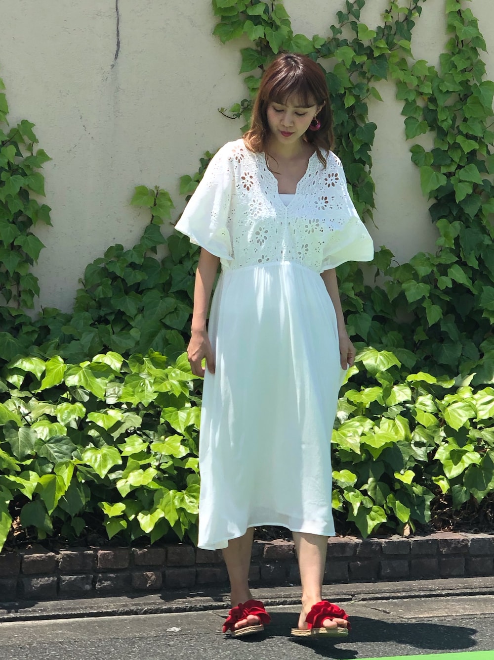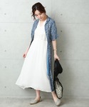 ホワイト系のワンピースを着用したレディースの春コーディネートの1枚目の写真