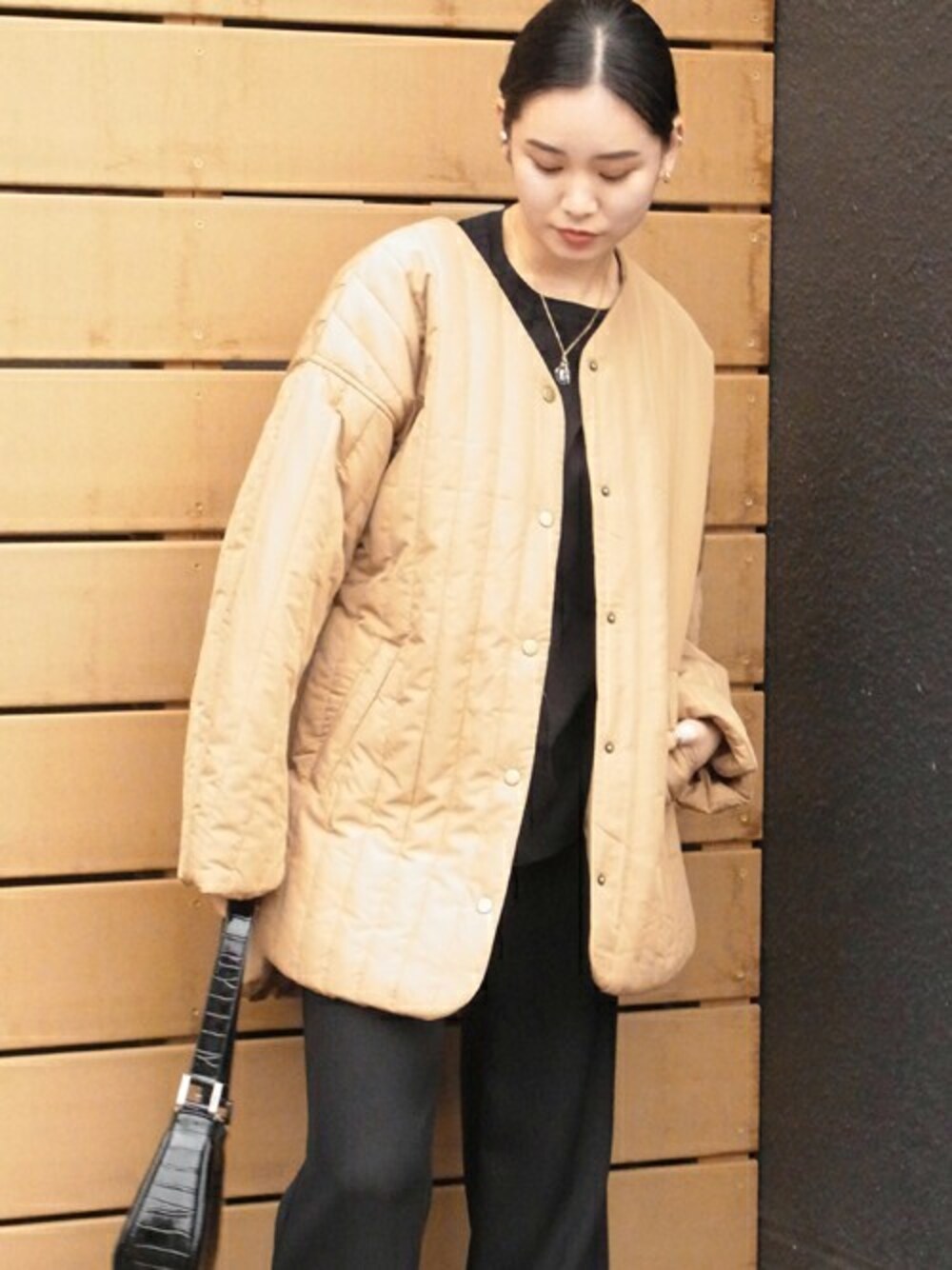 libelle more staffのノーカラージャケット「高密度タフタ縦キルティングジャケット」を使ったコーディネート