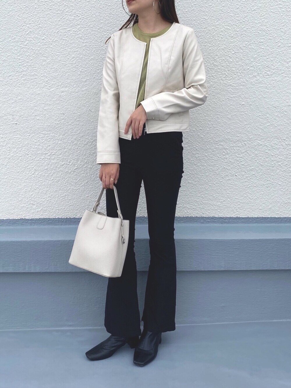 マットなホワイトエコレザーはパンツですっきりとコーディネートして きれいめスタイル🙆♀️ スカートやワンピースと合わせてフェミニンにも。 ショート丈なのでスタイルアップ効果あり◎