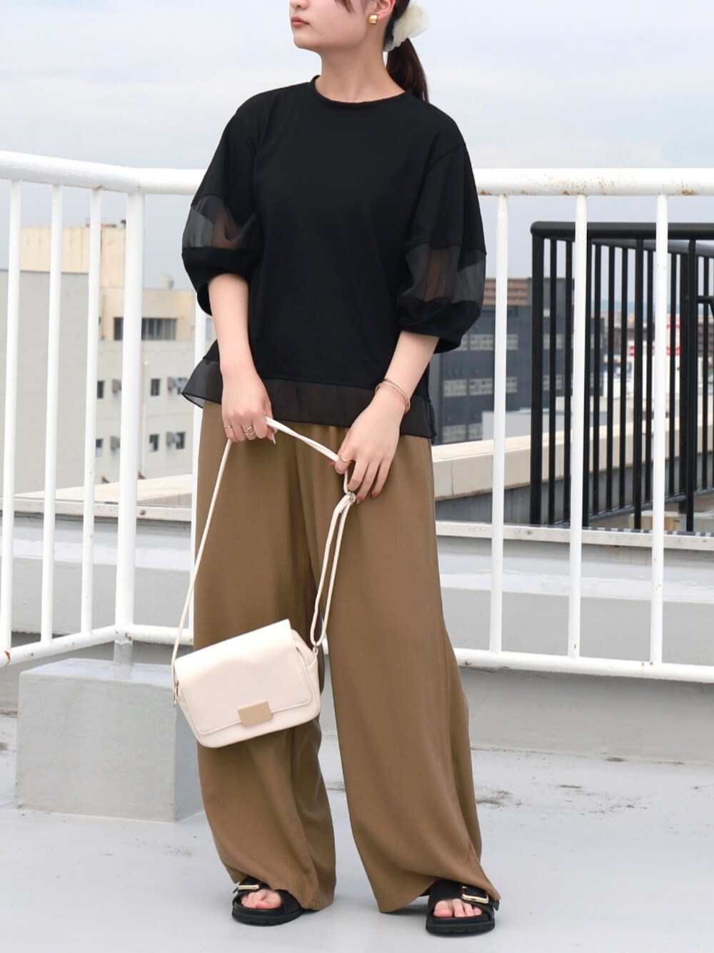 人気のブラック✕ベージュ コーデ 袖の透け感がブラックでも涼しげ ブラック Mサイズ着用 instagram @libellemore