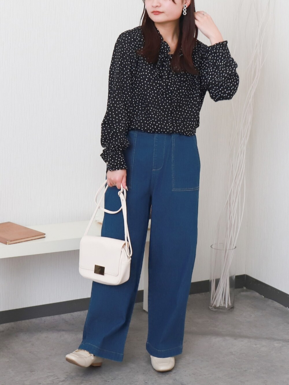 大人の可愛い秋のデニムコーデ🍂 リボンタイの水玉ブラウスに定番のデニムを合わせました。 リボンをほどいてこなれ感を出しても◎ instagram @libellemore