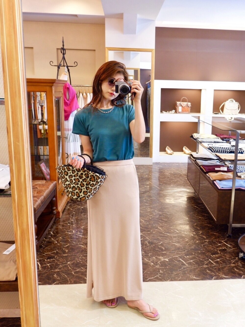 最近グリーンとベージュが 気になる、、🐢🐒 . マキシスカートって 大人な感じだし シンプルTに合わせるだけで 雰囲気出てスキ🥰💕 . . instagram👉emeraude_staff7