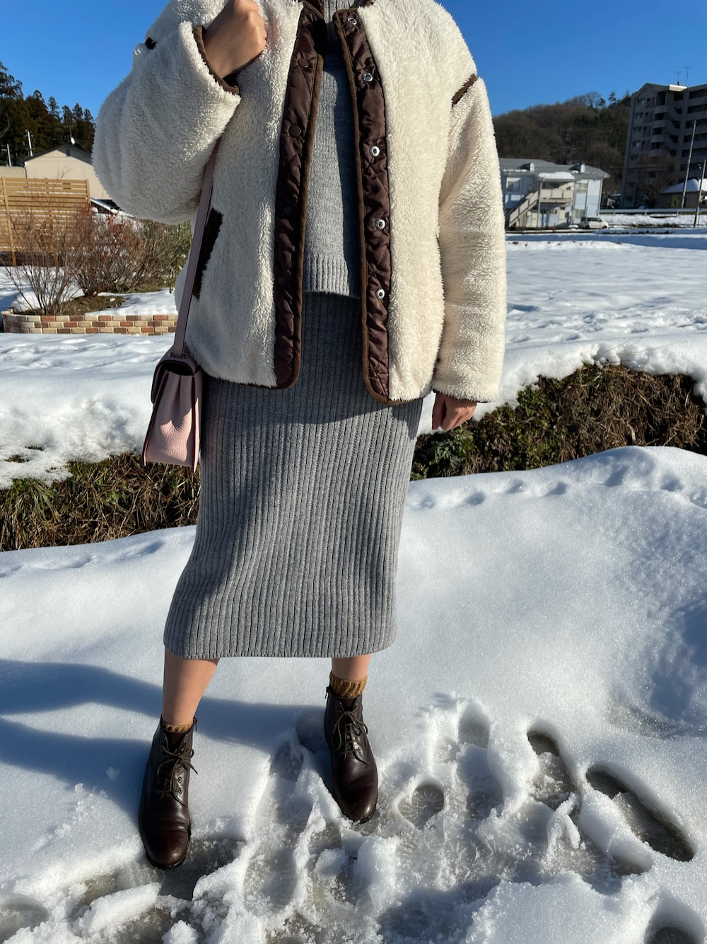 雪が多い地域では、せっかく買ったロングスカートが履けない😅 ニットワンピースはアウトレットで購入しました✨ アクセサリーは自分で作ったものを💍 instagram @nyantarou.noa