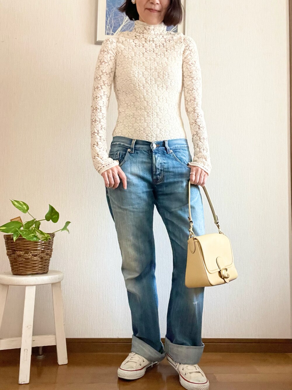 レースのトップスとメンズのダメージジーンズの甘辛コーデです。 コンバースのハイカットもいつもの定番で、ミックスコーデには欠かせないアイテム。 アクセはパールにしました。 冷え取り靴下もしっかりはいてます。