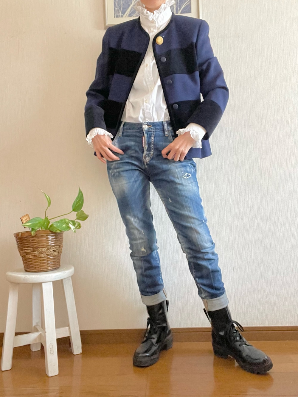 デニムの甘辛コーデがとても好き。 セレモニー用のビンテージのジャケットをカジュアルにしたくて、ダメージジーンズとワークブーツを合わせみました。