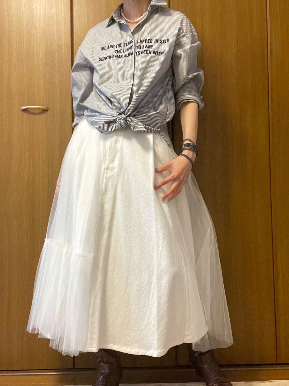 チュールスカートにメンズライクなストライプシャツを合わせました。 スカートがかなり甘いのでウエスタンブーツで辛さを。
