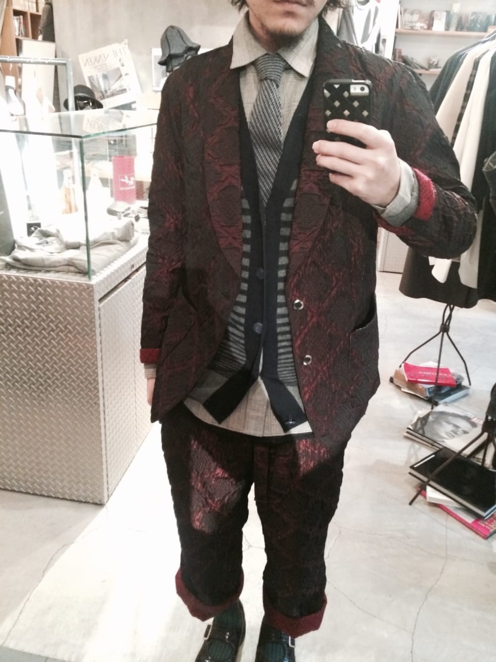 セットアップが柄が強いのでシャツ、カーディガン、タイをワントーンにしてまとめました。