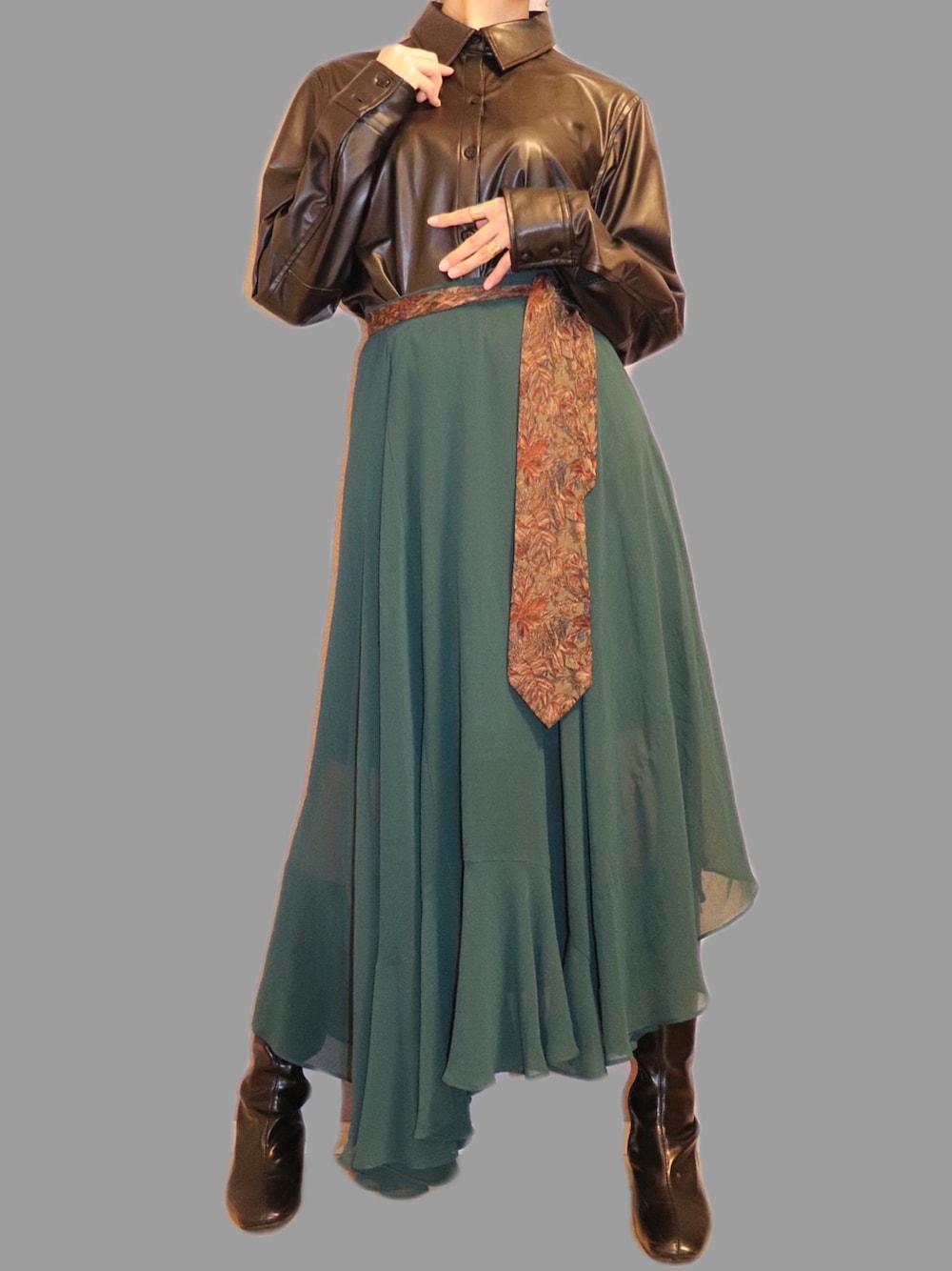 レザーシャツを女性らしく着こなすのに フレアスカートはもってこい🙆🏻♀️🖤 ネクタイをベルトとしてアレンジしてコーデの ポイントに📎