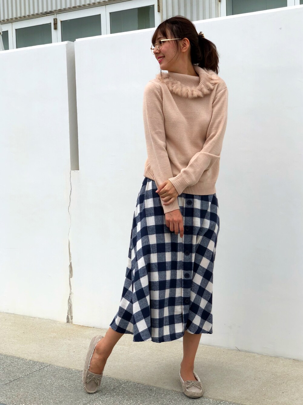 大きめのブロックチェックは起毛素材で 一気に秋冬感を、出せました。 こちらは、人気アイテムで着まわしも抜群です💓 トップスのラビットファー付きのタートルニットは、 もう間も無く入荷の先行販売予定です⭐️ モコモコシューズに合わせて