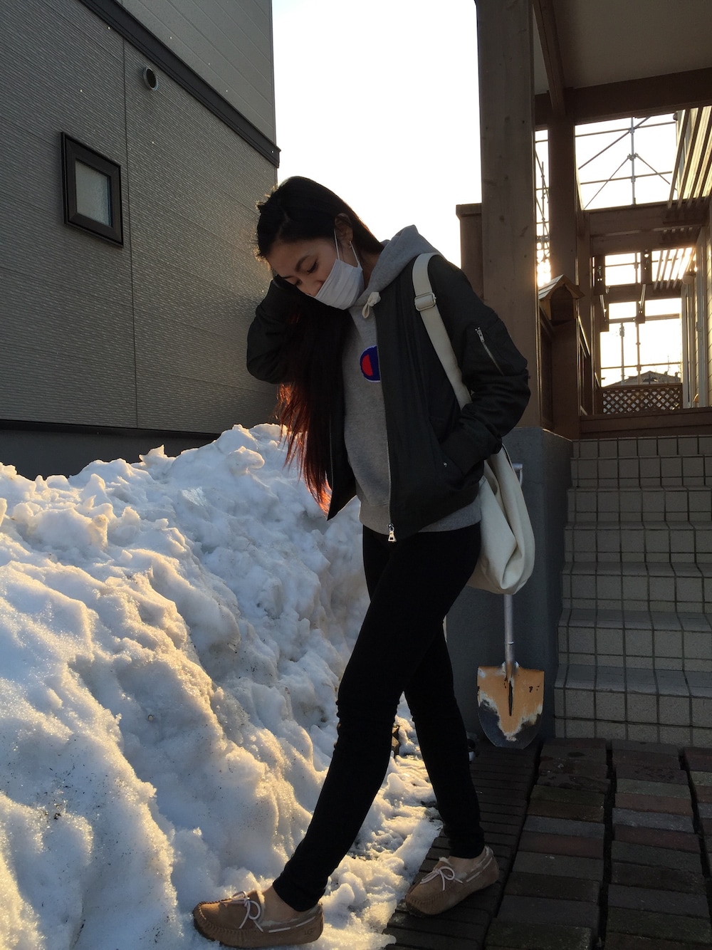 帰省中なラフコーデ🙌 RODEO CROWNS&Champion コラボパーカー♡ EMODAのMA-1 気に入ったー! でも北海道はまだまだ寒すぎました(´・_・`)