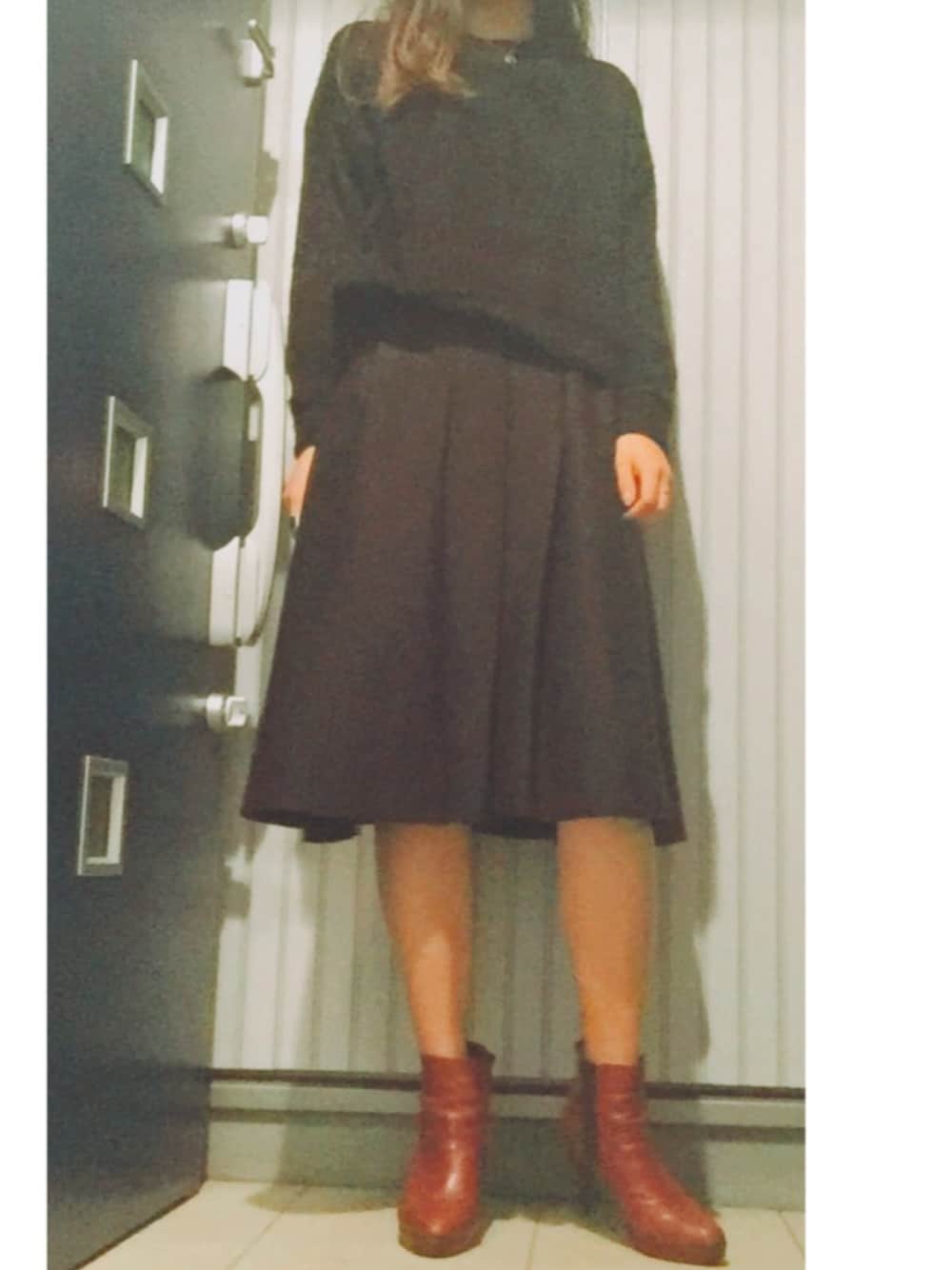 黒で統一したミニマルなスタイル。差し色で赤のブーツを。