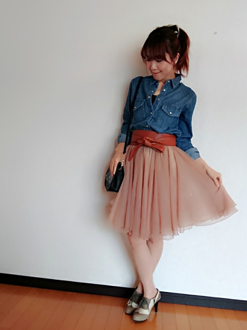 GUデニムシャツ990円×しまむらサッシュベルト980円で、トレンド感のあるコーデ。 スナイデルのチュールフレアで、デニムシャツをガーリーに着こなしました。