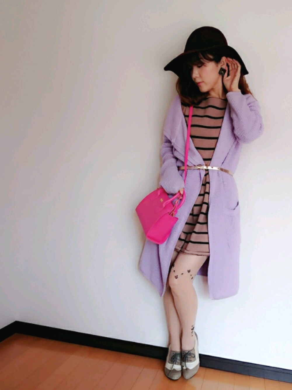 紗栄子さんが着ていたスナイデルの人気だったワンピース。ブラウンベースにパープル&ピンクの色が映えるコーデにしました。 3 COINSのアクセサリーが大好きで、コーデの多くに3 COINSのイヤリングを取り入れています。 毎日のように身につけているので、耳元は300円の女です(笑)
