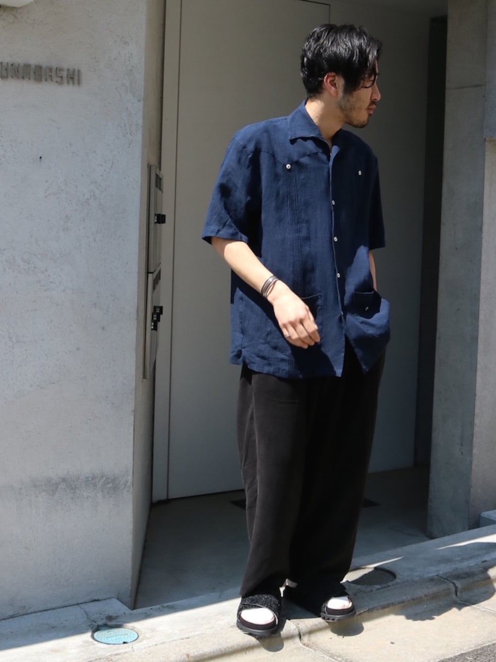 動きの出るテンセル素材の2タックパンツにリネン素材のキューバシャツを合わせて夏らしいスタイリングにしてます。 サンダルはラウンダバウトがダブルフットウェアーに別注したシャークソールのサンダルです。