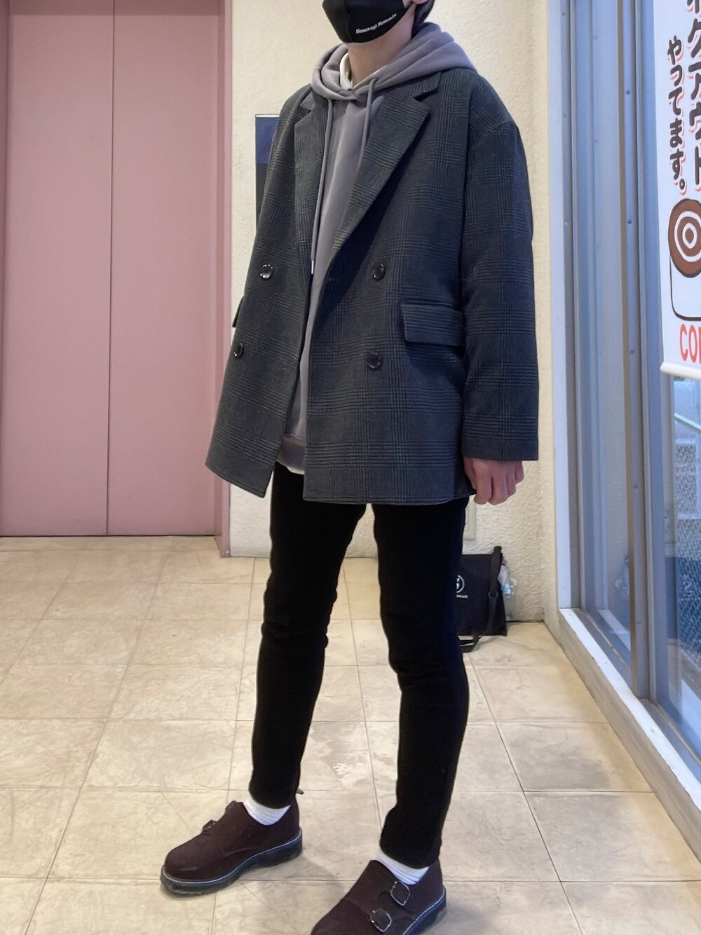 ご覧頂きありがとうございます! ジャケット:オーバーサイズダブルブレストジャケット パーカー:オーバーサイズスウェットプルパーカー パンツ:ハイウエストスキニージーンズ 靴:フェイクレザーモンクシューズ