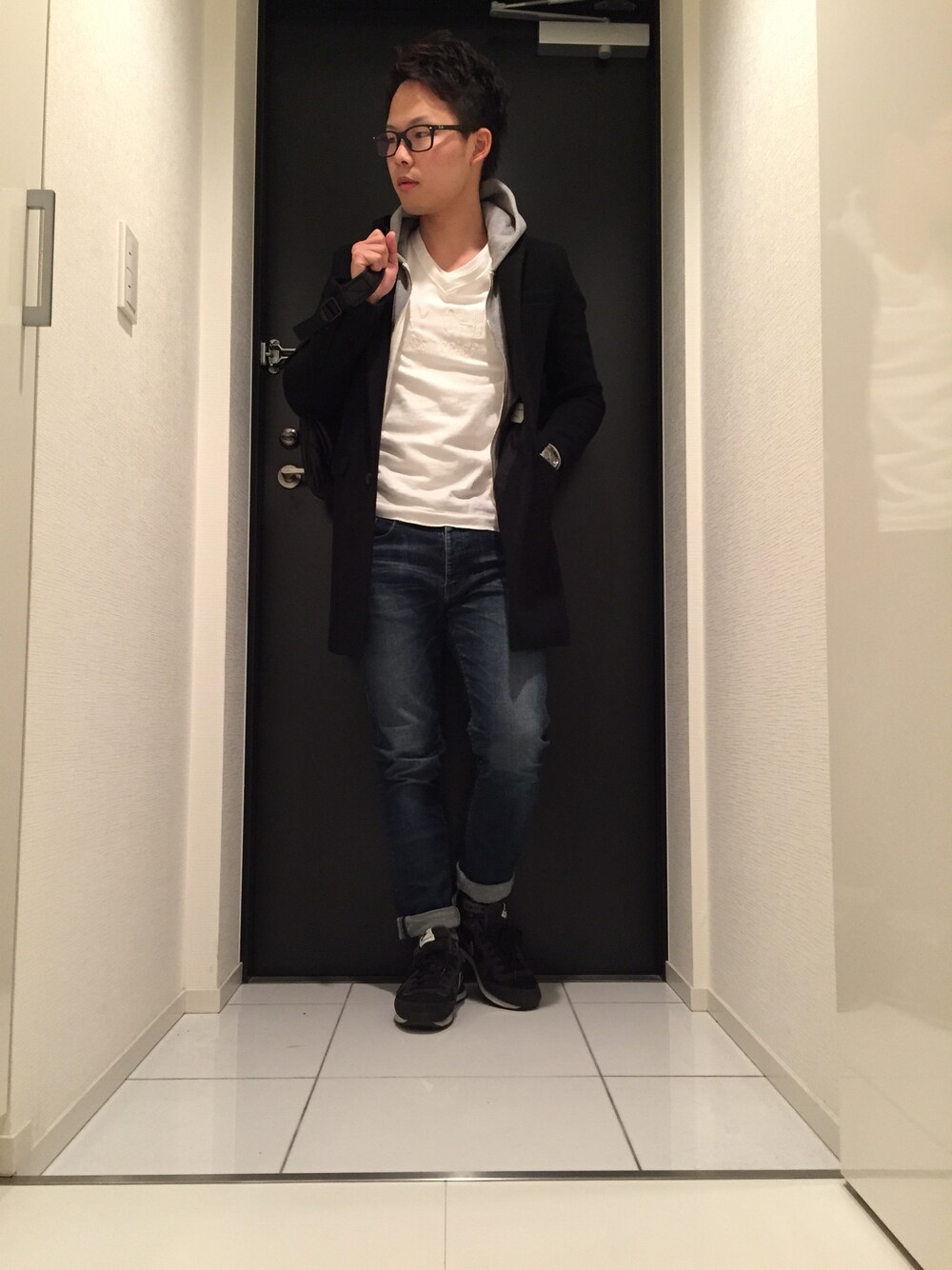 チェスターコート×パーカー×スニーカー