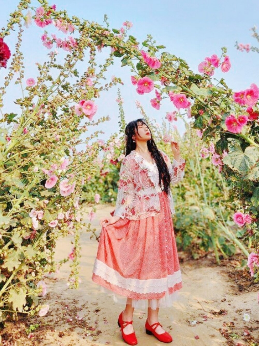 ❁ *.°✧⁺˳❁˚✧⁺˳❁ *.°✧⁺˳❁ 4月是生日月! 蜀葵花在台南盛開當然要去賞花慶生。 透膚刺繡古著襯衫當作外套遮陽,搭配Shimadoya 選品的merlot無袖日系洋裝散熱,鮮豔明亮是一定要的。 . 洋裝merlot 襯衫catch__your__eyes 鞋子m_an.2