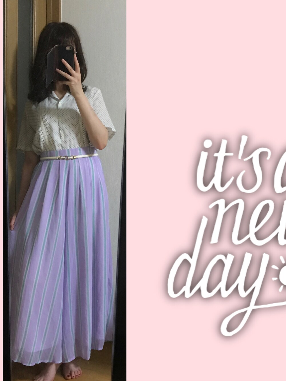 ご覧頂きありがとうございます❗️イイねとお気に入り登録してくださった方、感謝感激しております😂 古着屋さんで買った白地に細かいドットが入っている白ブラウスと紫のストライプワイドパンツを合わせた柄✖️柄コーデに、してみました^ ^