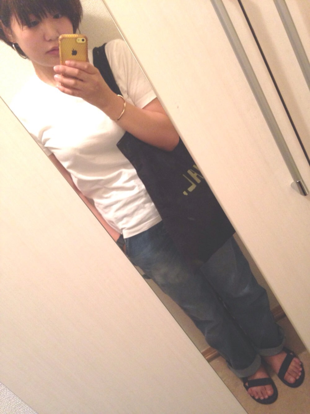usedのジーパンと白Tでゆるく。 小物は黒で引き締めて。