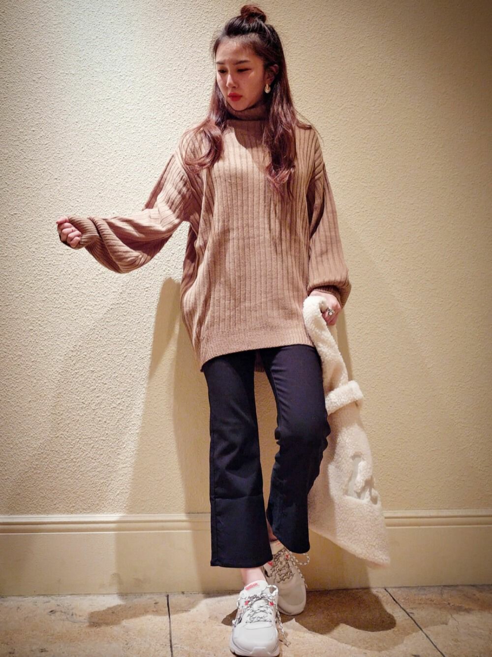 体型カバーラクチンコーデ 【タートルニット】 ・袖のボリューム◎ ・体型隠し力◎ 【フレアレギンス】 ・あったか裏起毛 ・裏起毛だけど厚すぎないので脚太くならない✌️ 【ボアバッグ】 ・いっぱい入るビッグサイズ◎ ・インパクト大! 【スニーカー】 ・Reebokコラボ!ポイントカラーのオレンジ◎ ・程良いボリューム感