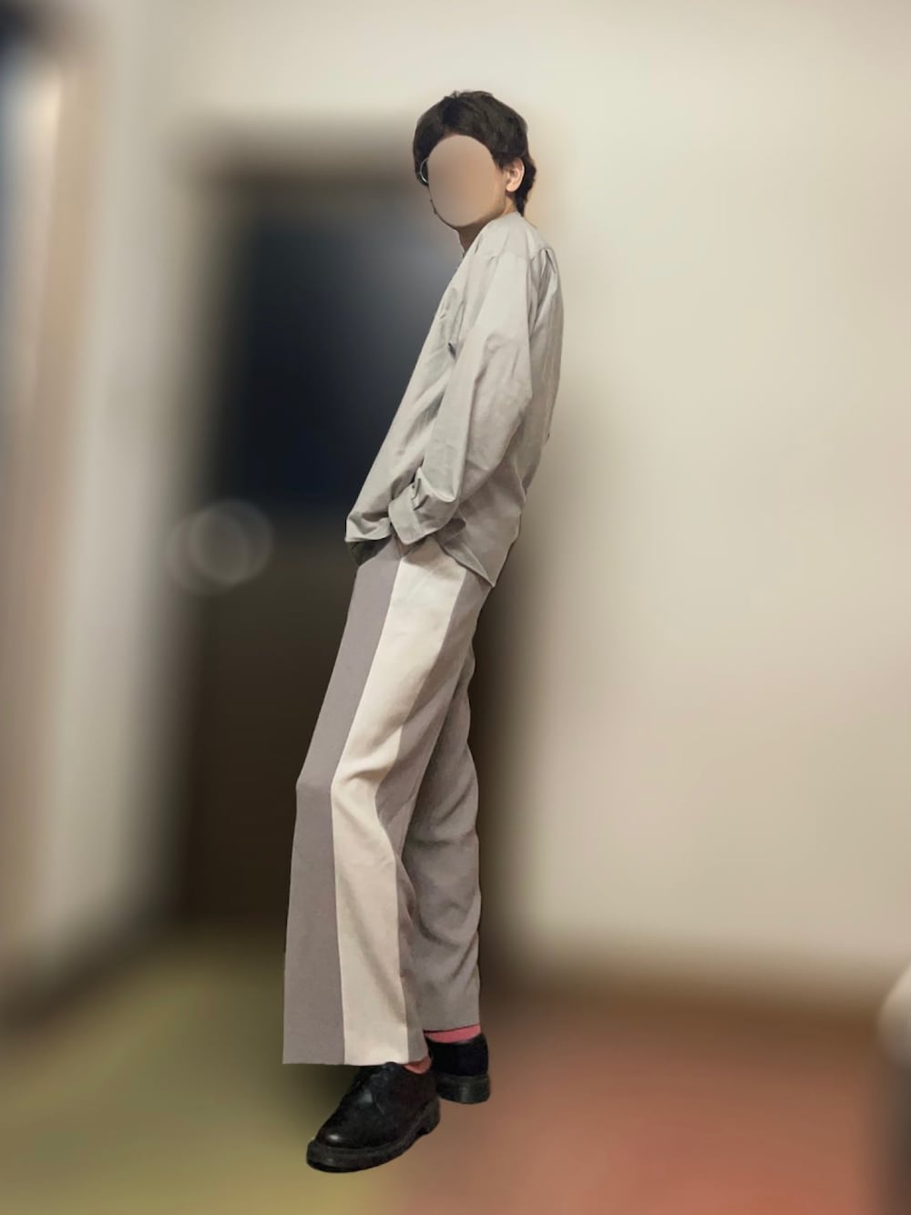 グレージュ系で上下揃えて靴下でアクセント。 シンプルっちゃあシンプルな気もする。