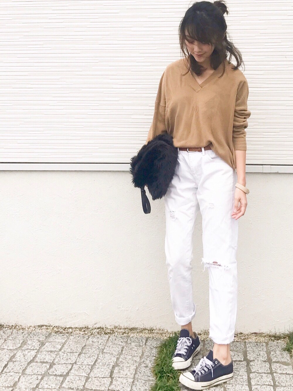 ホワイト系のデニムパンツ、ブラウン系のニット/セーターを着用したレディースの秋コーディネートの1枚目の写真