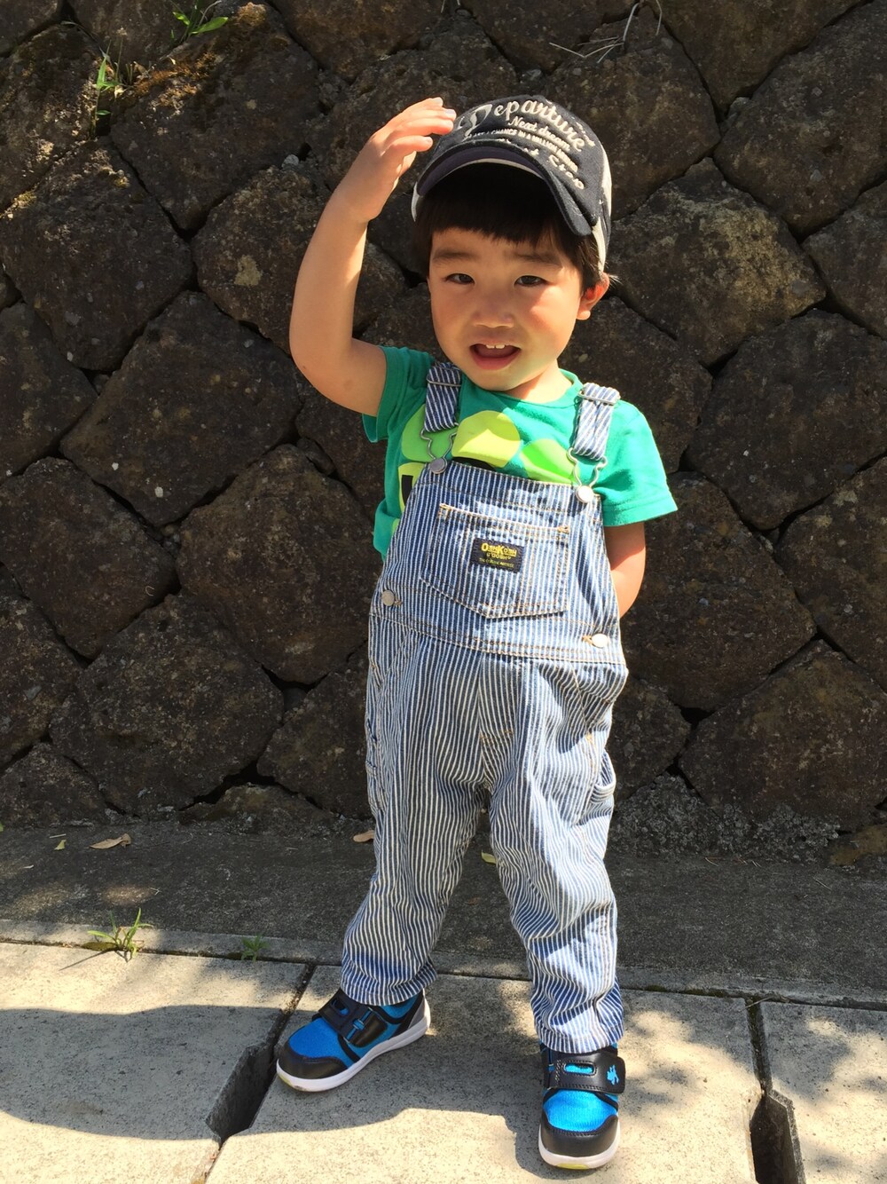 こどものオーバーオール姿はカワイイ。 オムツはずれたばかりだとトイレ騒ぎで大変になりそうなので、いまのうちに着せたいな。 でも、散歩から帰ってきたら 早速脱いでいた(´Д` )