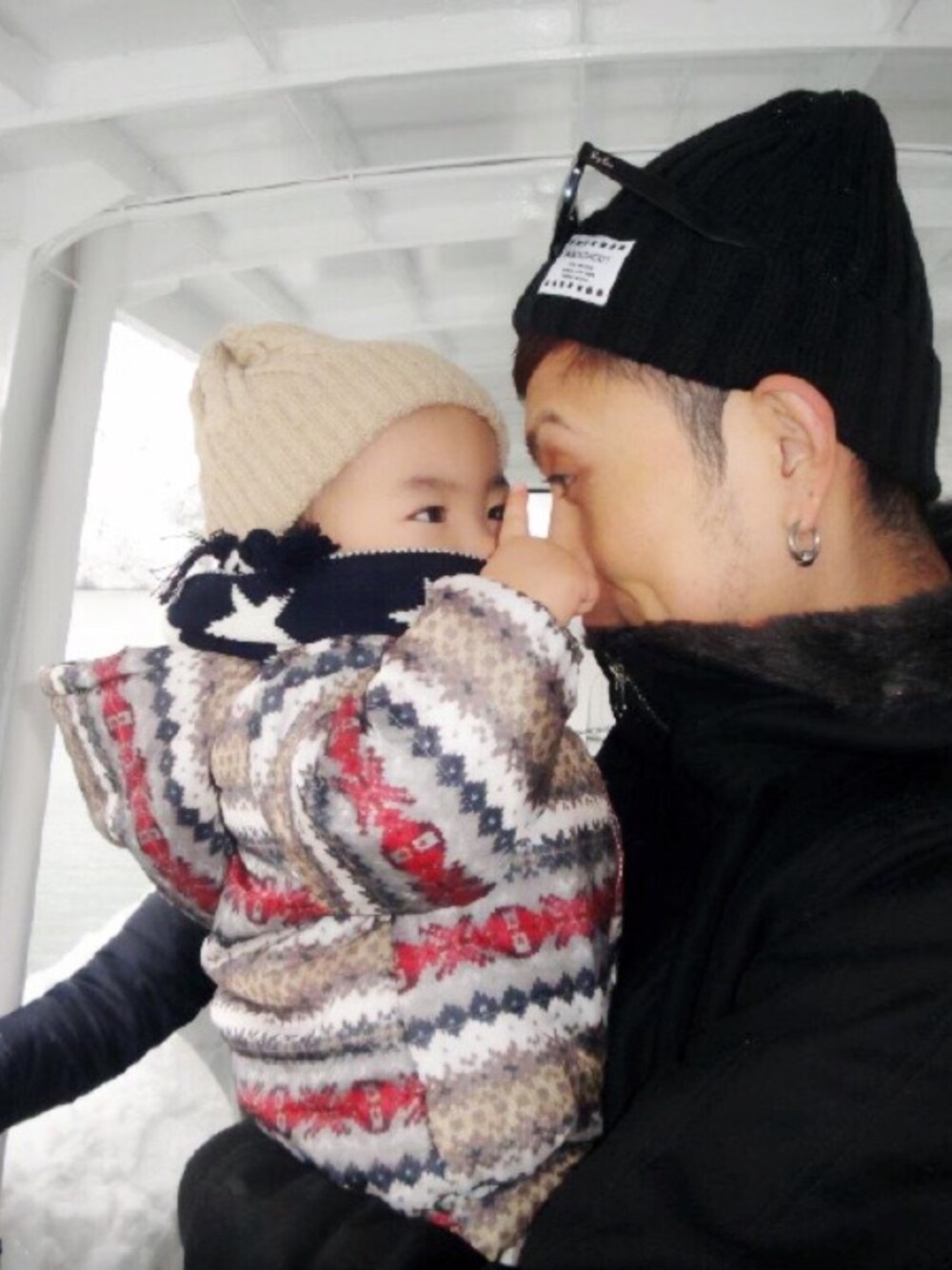 ブラック系のニットキャップ/ビーニーを着用したメンズの冬コーディネートの1枚目の写真